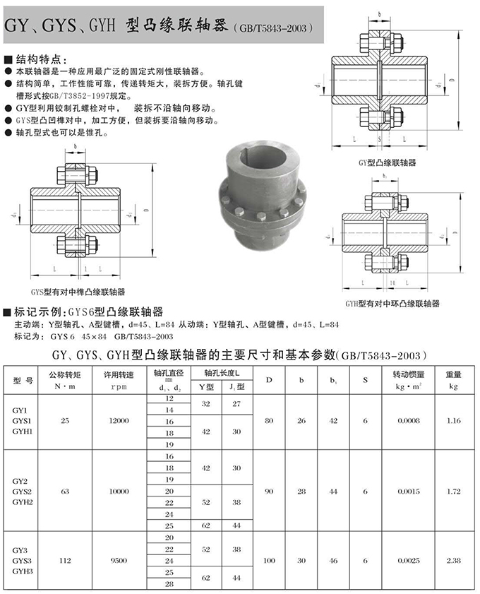 瑞安市寶德隆機械配件有限公司提供GY、GYS、GYH型凸緣聯(lián)軸器具有拆裝方便,快速安裝等特點,廣泛用于連接/固定輪轂孔和零件的軸,例如齒輪,錐齒輪,鏈輪,葉輪,凸輪,皮帶輪和飛輪等軸的聯(lián)結(jié)固定,咨詢電話:18906872378