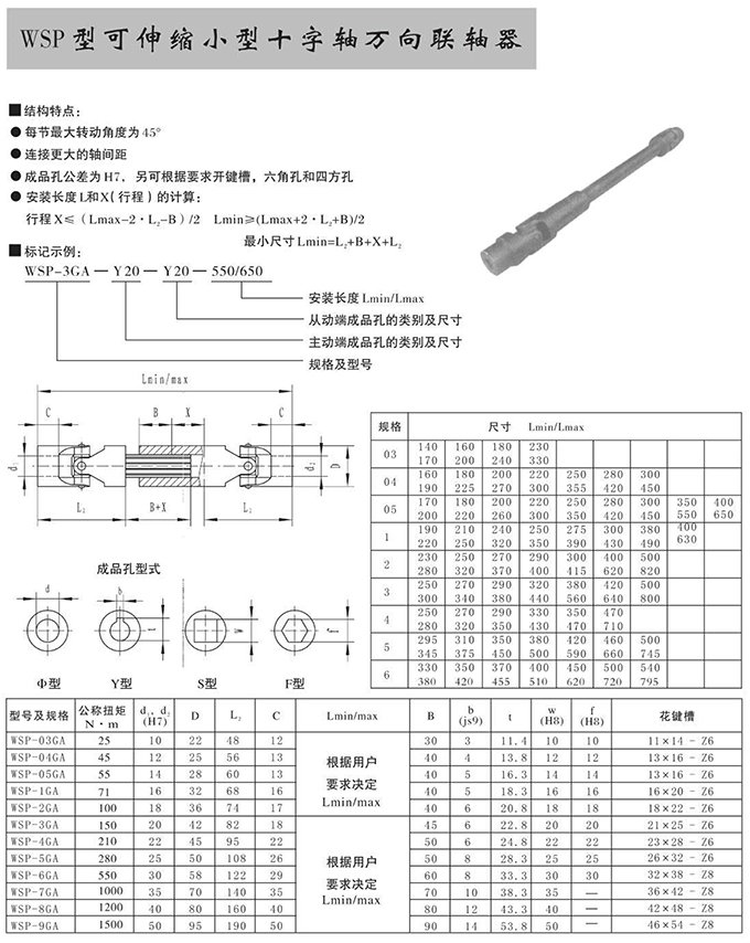 瑞安市寶德隆機械配件有限公司提供WSP型可伸縮小型十字軸萬向聯軸器具有拆裝方便,快速安裝等特點,廣泛用于連接/固定輪轂孔和零件的軸,例如齒輪,錐齒輪,鏈輪,葉輪,凸輪,皮帶輪和飛輪等軸的聯結固定,咨詢電話:18906872378